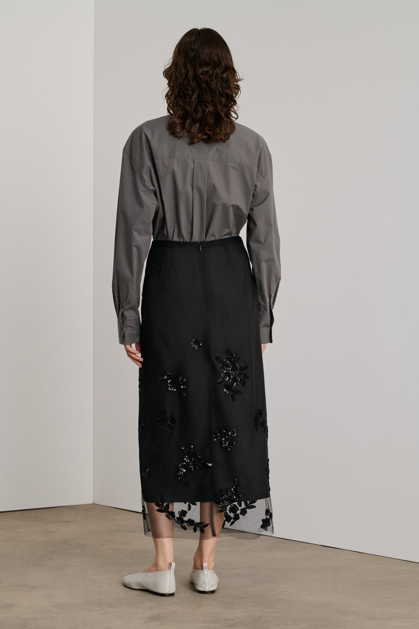 GRACE is an elegant long skirt in tulle and embroidery appliqués. Made in two parts: a lining underskirt to limit transparency, and a black tulle skirt over-embroidered with black sequined floral elements from bottom to top. It fastens with two invisible zips. Versatile, this skirt can be worn with or without its petticoat, depending on how daring you are.
